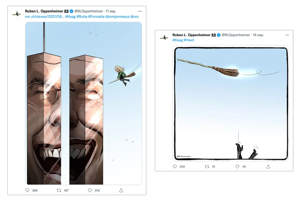 Oppenheimer followed up on his cartoon (and the buzz that it generated) with another cartoon on September 16th, 2021, the day of Kaag’s resignation. In this cartoon, Kaag is drawn up as a witch who has fallen off her broomstick (see Figure 2 on the right). The narrative seems to be: the witch who was well on her way in attacking Rutte has failed and is now in trouble herself. Just like Wilders, Oppenheimer depicts Kaag as an incompetent witch, captioning the image with the hashtags #kaag and #hexit.