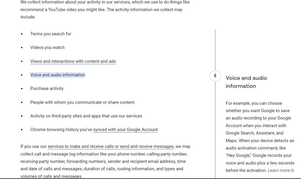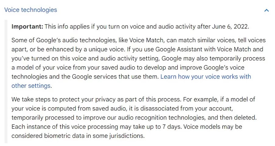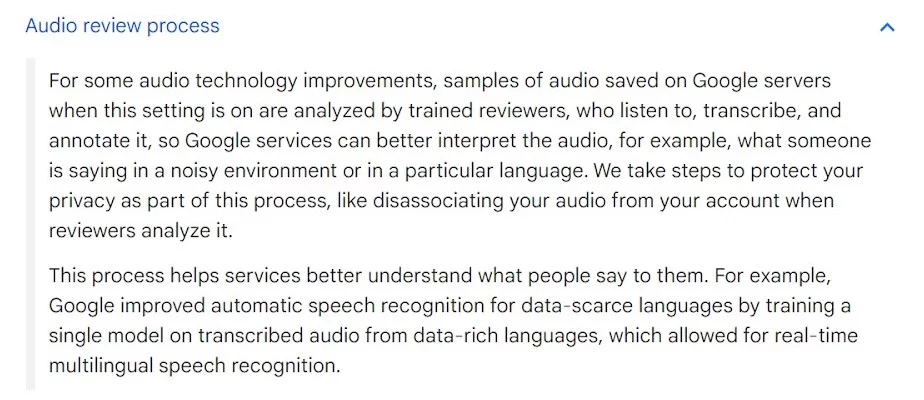 There are several ways Google does this, such as temporarily modeling a user's voice (figure 3) or the audio review process (figure 4) which means that stored audio recordings are analyzed by trained reviewers. This literally means that employees will listen to one’s recordings. And even when users disable the voice & audio activity, Google is still allowed to use undeleted recordings for business purposes. In 2019 it came to light that Google employees had been listening to users' private conversations, which involved conversations that should have never been recorded in the first place. Research (Verheyden et al., 2019) found that these recordings not only contained sensitive information, such as bedroom conversations, but also professional phone calls containing private information, such as names, addresses and medical information. After this scandal, Google has adjusted its privacy policy as seen in figure 3 and 4, in which users are now informed about reviewers listening in on their conversations. Google (2022) states “we take steps to protect your privacy as part of this process, for example, by disassociating your audio from your account”. But, it does not take a rocket scientist to recover someone's identity; employees simply have to listen carefully to what is being said. If they do not know how certain words are written, these employees have to look up every word, address, personal name or company name on Google. In that way, they often soon discover the identity of the person speaking (Verheyden et al., 2019).