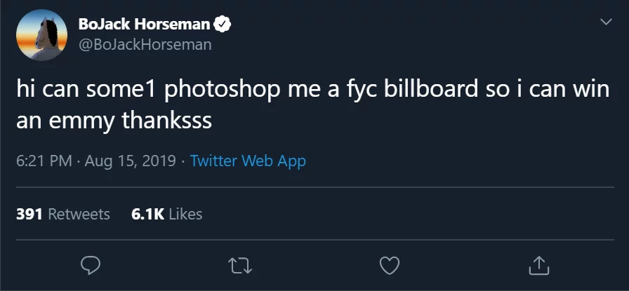 Being a viewer of BoJack Horseman is anything but a passive pastime. The “real life” BoJack encourages his fans constantly to engage with the show. This ties in perfectly with what we discussed before in regards to participatory culture. For instance, in August of this year he asked his followers to photoshop billboards for him so he could get an Emmy. This is a direct reference to the fact in the show he, try as he might, cannot seem to acquire such a prize. Something always happens, causing him to lose out on his one dream, winning an Emmy.