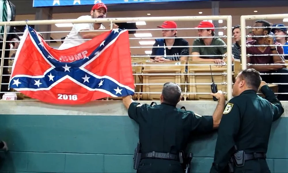 Context is important in the construction of the meaning of ‘we’. We should remember that Trump speaks in a Southern state, for a Southern, predominantly white Republican audience. An audience that puts up a confederate flag stating 'Trump 2016'. The stress on ‘our people’, makes it abundantly clear what he means. There is no need for Trump to make this explicit – it would only open the gates for criticism - ; the ones who need to understand, understand it. That is why he has the support of the Alt-Right, the Ku Klux Klan, white evangelists, Southerners, and jobless people including Blacks and Mexicans. His value-based definition allows them to imagine themselves as part as the American people; and at the same time it allows him to please racists.