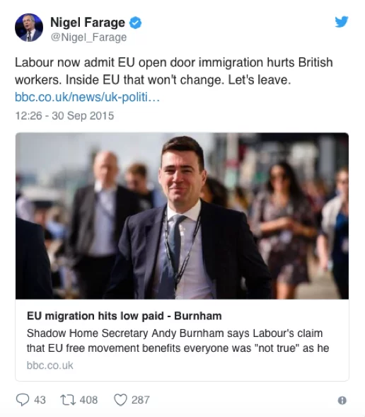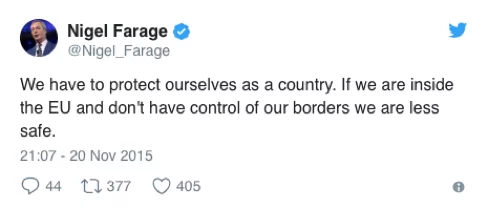 One of the most prominent arguments of both Nigel Farage and Vote Leave to leave the European Union was the migrant crisis and border control issue. In his speech broadcasted by Sky News on the 29th of April 2016, Farage said: “… and the fact that we have refused to shy away from the most imminent and urgent threat and problem that faces this country, namely open door immigration and the security and social implications of it” (Sky News, 2016: 0:53-1:08).