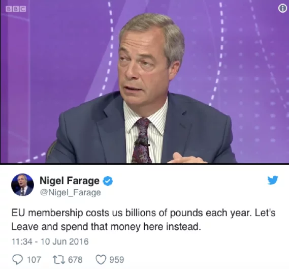 Another movement that was campaigning for Brexit was Vote Leave. Funded by Peter Cruddas and supported by Boris Johnson, the leaving mayor of London, Vote Leave had the same goal as UKIP and Nigel Farage, but their approach was slightly different. Where Nigel Farage stood out with his message of being a straightforward radical drinking guy, who puts a lot of emphasis on mentioning the bad things of being part of Europe, Vote Leave used a gentler approach by aiming to give England back to its rightful people and campaigned really positively by stating all the advantages for Britain as a result of leaving the European Union (Vote Leave, 2016). For example, Vote Leave would focus on Britain, saying they would be able save £350 million a week to use for their own good, while Farage would never miss out on a chance to criticize the EU, stating the costs of staying in the EU (Figure 12).