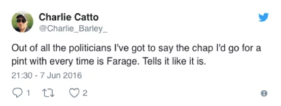 Nigel Farage is perceived as a straightforward beer drinking guy from the working class, who says it as it is. This approachable message made it possible for Farage to reach the working class and even some of his adversaries. His critics see him as a lying radical racist, who is unworthy of representing the country. The negative image does not hurt his message perceived by his fans, as they consider being radical as being straightforward and speaking your mind.