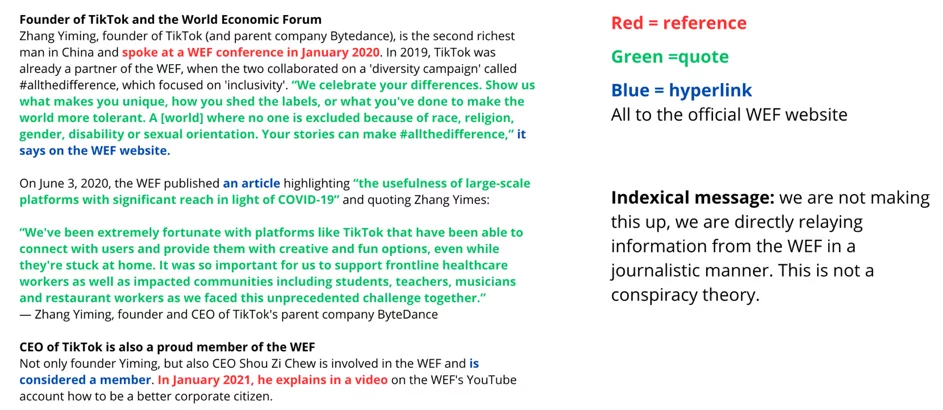 The scriptural inference (Tripodi, 2018) found in the article by De Andere Krant is also present is this article by Café Weltschmerz. Most of the explicit intertextuality consists of quotes from and references to official statements by the World Economic Forum and TikTok management. Contrary to De Andere Krant, Café Weltschmerz does use hyperlinks to refer to the sources of their quotes. This hyperlinking practice implies that Café Weltschmerz is not just imagining a conspiracy theory, but that this conspiracy is actually happening out in the open.