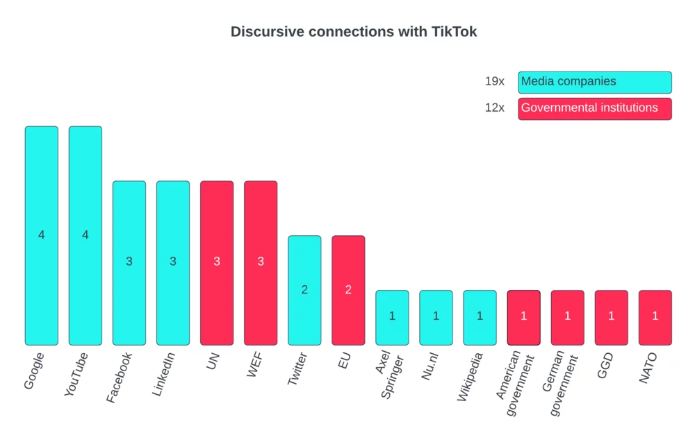 In a similar fashion, TikTok is discursively connected to governmental institutions a total of 12 times (Figure 2). In the data, the social media platform is most often connected to supranational institutions, like the UN, the EU, NATO and the World Economic Forum. One example is the article "VN-functionaris op WEF-bijeenkomst: ‘De wetenschap is van ons'" (UN-official at WEF meeting: 'the science belongs to us') by BLCKBX TV, which revolves around a UN official discussing how they work together with Google and TikTok to tackle disinformation at a WEF-meeting.