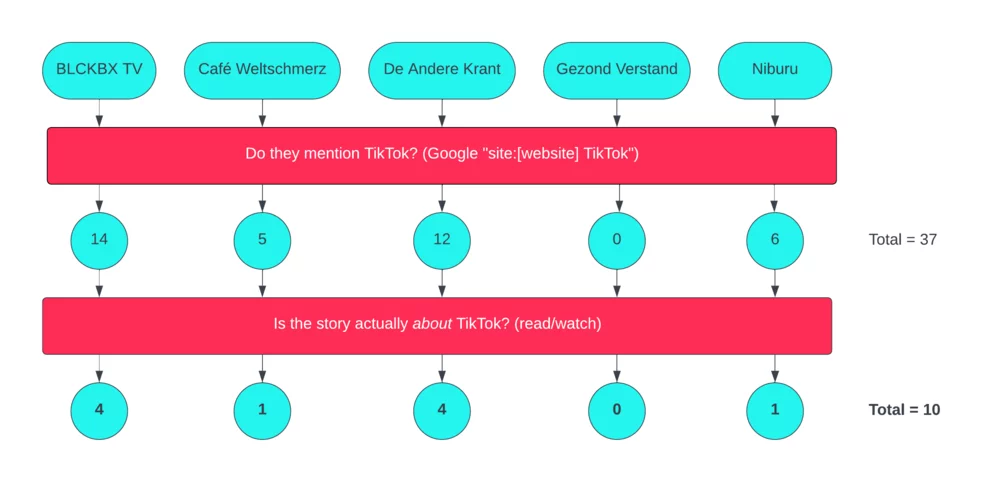 The websites of all five media were parsed for content about TikTok using the Google search query “site:[website] TikTok”, which searches all pages on a website for the word ‘TikTok’. This resulted in a total of 37 webpages that mentioned TikTok. Most webpages that mentioned TikTok were found on the websites of BLCKBX TV (14 webpages) and De Andere Krant (12). 6 pages were found on the website of Niburu and 5 on the website of Café Weltschmerz. Notably, Gezond Verstand did not publish any online content about TikTok.