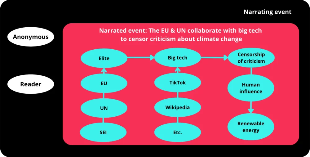 The first key narrative that is used to link TikTok to existing narratives of censorship and propaganda is about how TikTok is ‘censoring counternarratives’. The article “Klimaatcensuur wordt steeds scherper” (Climate censorship is getting ever tighter) by De Andere Krant focusses specifically on narratives countering the scientific consensus around climate change. The narrating event in this article plays out between the anonymous author of the article and the audience, while the narrated event is about how the EU and the UN collaborate with Big Tech to censor criticism about climate change.