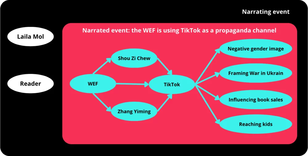 The propaganda side of the coin is strongly foregrounded in the article “TikTok is partner van het WEF en creëert trend: tienerjongens willen meisjes vermoorden op dates” (TikTok is partner of the WEF and creates trend: teenage boys want to kill girls on dates) by Laila Mol for Café Weltschmerz. The narrating event in this article plays out between Laila Mol and the reader. The narrated event is about how the World Economic Forum is using TikTok as a propaganda channel. Specifically, the article describes how the World Economic Forum is connected to TikTok (both directly and indirectly via founder Zhang Yiming and CEO Shou Zi Chew, both members of the WEF) and uses this connection to push a progressive agenda. According to the article, the WEF and TikTok work together to reach kids, demonize men by pushing femicide fantasy trends, decide how the war in Ukraine is framed by influencing the algorithm, and push progressive books via the BookTok trend.