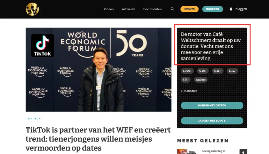 And to be clear: the World Economic Forum and TikTok do collaborate. But we have to remember that the way conspiracy media frame this collaboration is deeply rooted in their imagined 'ideological' struggle. In their worldview, this collaboration is yet another example of the elite controlling the base and superstructure of society for their own benefit and the oppression of ‘the people’. But rather than engaging in an actual material analysis of the nature of the collaboration between the WEF and TikTok, Mol simply uses these different elements (the people, TikTok, WEF) to fill the populist discursive template is service of the worldview of the medium and its presumed audience. This worldview is confirmed by a big call for donations in the sidebar of the webpage. It reads: “The engine of Café Weltschmerz runs on your donation. Fight along with us for a free society”.