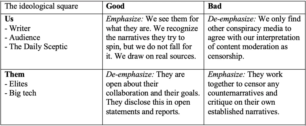 This article is emblematic of the narrative that TikTok is censoring counternarratives (in collaboration with elite governmental organizations), which is portrayed in a total of 5 articles in the data. We can summarize this narrative as a poplist conflict in group relations between ‘the people’ (Us) and ‘the elite’ (Them) that is at the root of conspiracy culture by plotting it in an ideological square (Van Dijk, 2011).