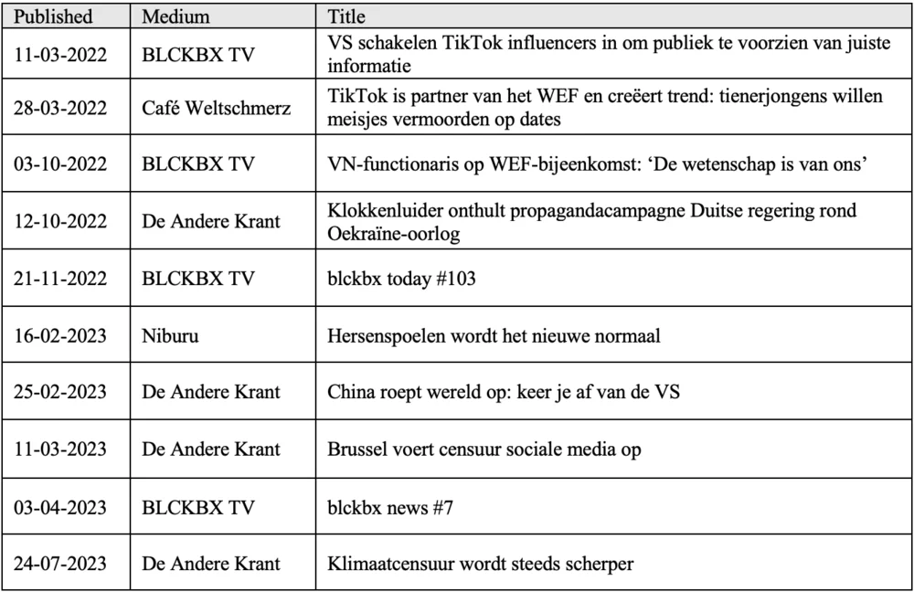 All 37 webpages that mentioned TikTok were read (and, if the webpage contained a video, watched) to determine if the page actually was about TikTok. This process excluded 27 webpages, for example because they only mentioned TikTok in passing, or because they only referred to a TikTok video in an article about another topic. That means 10 articles remained for analysis: 4 by BLCKBX TV, 4 by De Andere Krant, 1 by Café Weltschmerz, and 1 by Niburu. The first article was published on 11 March 2022, the most recent one was published 24 July 2023.
