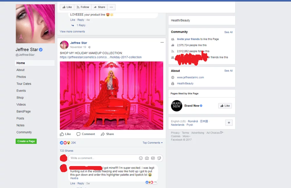 By analyzing his Social Media presence we can find out more about what he beliefs to be the way to become authentic, successful and popularthe norms that are shared by this group. These norms are mostly about make-up trends and how-to's, but the shared underlying belief is that males can use make-up too and express themselves as they please. In a recent Facebook video Jeffree Star promotes the no eyebrow trend, saying that he doesn't need eyebrows and that therefore it shouldn't be considered the "normal" thing anymore.