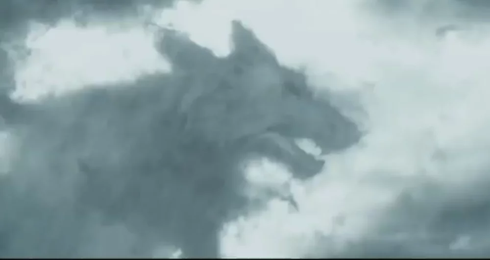 Throughout the rest of the movie, the audience is encouraged to understand the Grim as specter. For example, he shows up in the shape of a cloud formation to scare Harry off his broomstick during a game of Quidditch. [see figure below] Even when we eventually find out that Sirius Black is a benevolent character who can turn into a dog, the movie never refers back to these earlier instances or tries to explain the incongruencies of those moments. In this movie adaptation, then, we are left with an uncertain status for the creature: he seems to be both Animagus, that in-between form of human/animal, and Grim, the spectral dog that announces death to human characters. In an older episode of the Witch Please podcast, Kosman sums up her frustration with this re-positioning of the Grim: