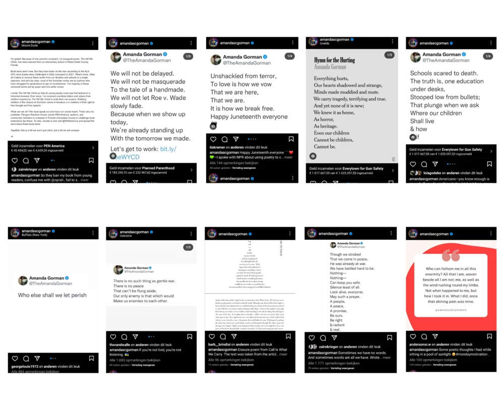 Amanda Gorman seems to mostly share screenshots of her Tweets, with only one of the poems being an actual Instagram post. We might wonder whether screenshots from X can serve as Instapoetry or not. However, she is included in three out of the ten lists of poet-users, which means the general opinion seems to be 'yes'. Sharing screenshots from X constitutes a creative way to circumvent Instagram’s affordances of image sharing, and adhering to a different materiality than the other poets. Using a different social media platform which focuses on texts and sharing a screenshot of this posted text on Instagram could be interpreted as a poet-user finding a way around the restricting affordances of Instagram, just like the pictures of Leav’s physical poetry bundles that were mentioned earlier.