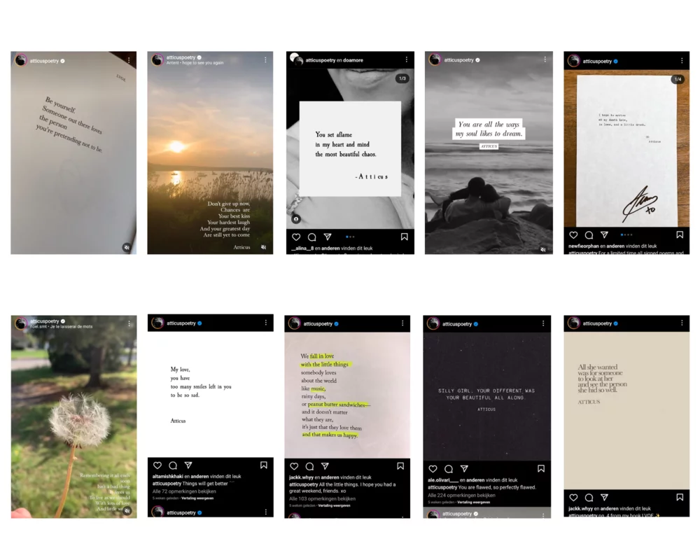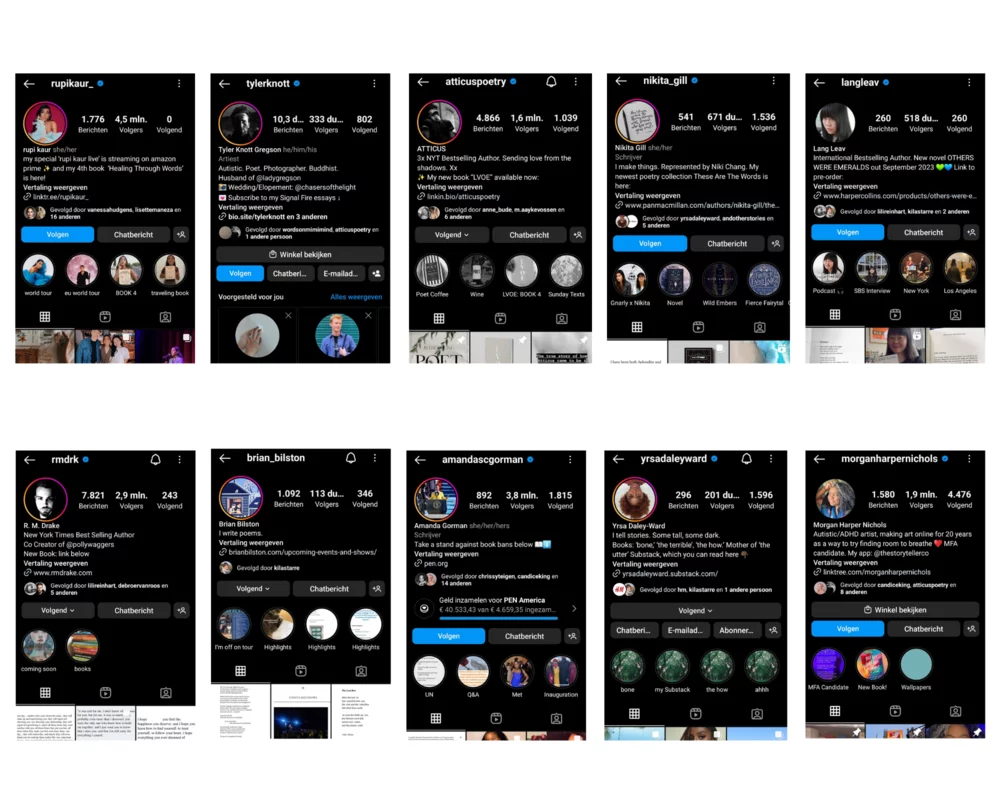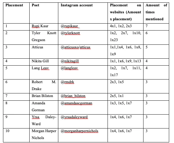 The ten studied poet-users were selected by comparing the first ten web results when typing the prompt “Top 10 Instapoetry accounts to follow” in Google. The incognito mode was used to bypass personalized results as much as possible. The 'top 10' lists were recorded, which resulted in a file with 57 different Instapoetry accounts. Four accounts with general poetry were deleted from the file since this study focuses on poet-users and their poetry. Then, to select ten out of the remaining 53 poets, it was calculated which poets appeared most often on the ten websites. Because this study focuses on the influence of Instagram’s affordances on Instapoetry, this study will only look at the last ten posts (on May 24th, 2023) with poetry, not with other pictures or drawings.