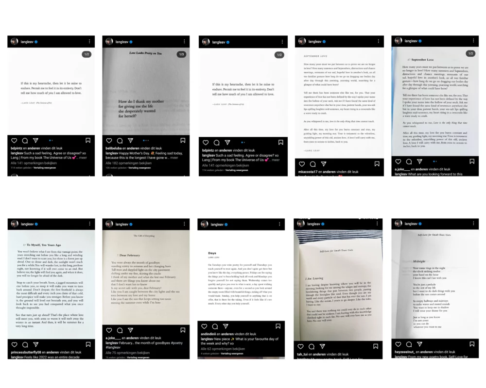 Lang Leav also shares only texts as posts but does it in a different way than Brian Bilston and Robert M. Drake. The portrayal of Leav's texts is more varied. Sometimes it is an uploaded digital text, similar to Bilston's and Drake's texts. Leav, however, also shares pictures from poems taken out of her books as Instapoetry. This can be viewed as an advertisement of her books as well, especially with captions such as: “From my book” or “From my new poetry book”.
