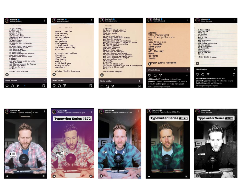 Rupi Kaur seems to share poems from her poetry bundles and includes the names of those bundles in the description of her posts. In this way, the reader can easily look up the book they are interested in online. Tyler Knott Gregson includes a clickable link in his images (see: the “Winkel bezoeken” [visit store] bar on the bottom of each image) that leads the user to his webstore. When he uploads a ‘Typewriter Series’ post he seems to talk often (four out of five times) about the possibility of buying the poem on his website. Atticus only mentions his bundle's name in the description of one post, without a link. Lang Leav does the same as Atticus but does mention the bundles more often: in five out of ten posts.