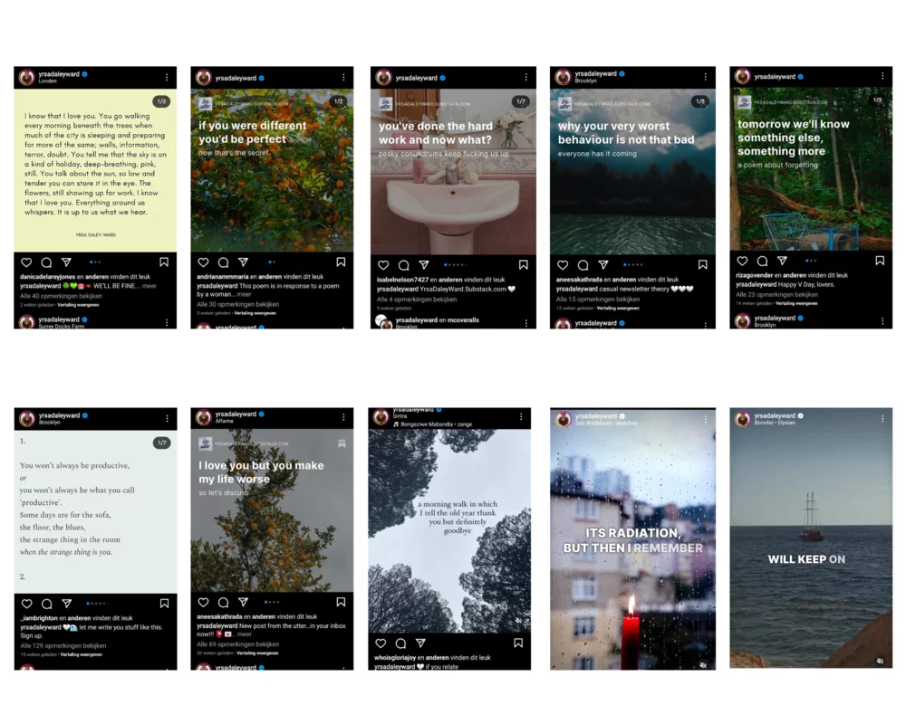 The colours are either nature-inspired or black and white, and he often works with text boxes over images or reels. Yrsa Daley-Ward’s style is striking because of the before-mentioned images of a sink and a shopping cart, which appear. to be not directly related to the poem following in the slideshow. However, she has a strict colour scheme, with the images — which are full of colour — being made less bright to perform as backgrounds. The reason for this practice might be that Ward does not work with text boxes. A low brightness means that white typography placed over the image can be enough to ensure readability. In two out of the ten images, Ward only uploads a yellow or white image on her feed with black text on it.