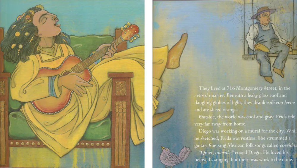 Schrijfster Novesky zet ook enkele Mexicaanse tradities in de kijker. Hiervoor maakt ze gebruik van drie Spaanstalige termen, die dankzij cursivering meteen in het oog springen. Ten eerste drinken Frida en haar echtgenoot een café con leche. In ‘The Use of Spanish in Latino Children’s Literature in English: What Makes for Cultural Authencity?’ stellen Rosalina B. Barrera en Ruth E. Quiroa (2003, p. 253) vast dat Spaanse culinaire termen worden ingezet vanwege de onmiddellijke associatie met de Latijns-Amerikaanse cultuur en vooral ook wanneer er geen Engelstalige equivalenten voorhanden zijn. In dit geval is een Engelse vertaling denkbaar (‘coffee with milk’), maar Novesky kiest ervoor om de Spaans-Mexicaanse eigenheid van de drank te onderstrepen. Vervolgens refereert de auteur aan een Mexicaanse muziektraditie: ‘[Frida] strummed a guitar. She sang Mexican folk songs called corridos’ (eigen nadruk). Voor dit woord is er inderdaad geen gepaste vertaling. De schrijfster verklaart het begrip via een korte omschrijving vooraf (Barrera & Quiroa, 2003, p. 258) en op de bijhorende illustratie leeft Frida zich effectief uit op haar gitaar (afbeelding 3).