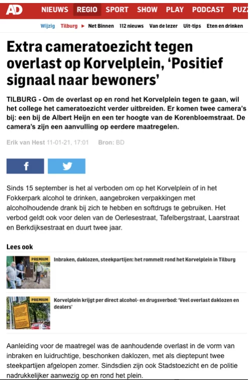 Van Hest, E. (2021). Extra cameratoezicht tegen overlast op Korvelplein, "Posities signaal naar bewoners", Algemeen Dagblad. Retrieved from: https://www.ad.nl/tilburg/extra-cameratoezicht-tegen-overlast-op-korvel…