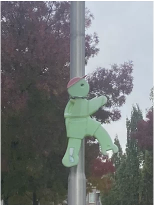 Lastly, there are also individuals in Korvel who participate in its surveillant landscape. People use (spiked) fences, gates, blinds, intercoms, and doorbells as we have seen earlier. Cameras while less common than for companies seem to be rather prevalent. Even so, these are mostly doorbell-type devices nowhere near as complex as a full surveillance system. Individuals also use signs to influence each other's behavior. In the photo below, you can see how an individual has taken it upon themselves to make the streets around a school in the district safer by making drivers aware of possible danger.