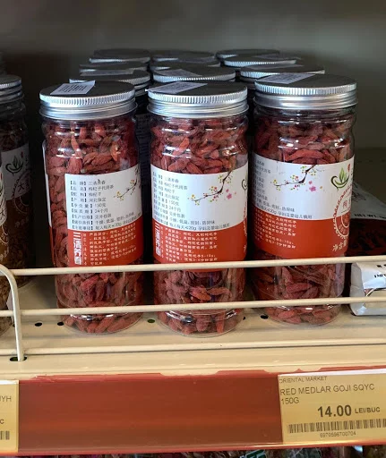Looking around the store, we have come across some jars filled with goji, which is used in China and Tibet as a culinary ingredient but also has a medical purpose. Here, the tag on the jars is written in Chinese, while the tag describing the product on the shelf is written in English. Moreover, the currency used is Romania’s LEI. (Figure 2) Therefore, there is a mix of cultures revealed through small details.