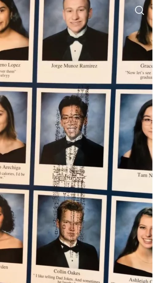To begin with, the first level of using glitch text will be addressed; the use of this practice is purely for fun. The TikToker Jooystin in the year 2019 made use of glitch text in his graduation yearbook. In this yearbook, all students had to hand in a senior quote via Google Forms, which could be used under their school picture. Jooystin had the idea to copy and paste the word "hamburger" with excessive diacritical marks in each letter causing a mess in the layout of the yearbook, which in turn covered Jooystin's picture and that of one of his classmates in glitch text. This caused difficulties in the visualization of both pictures. As it is seen in this case, this person simply had the curiosity to copy and paste a glitched text into a physical object, this is used as a practice merely for fun and entertainment purposes.