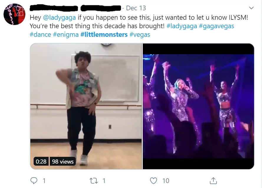 Further, the ways how celebrities use social media nowadays heighten the sense of intimacy and offer greater possibilities for interaction (Marwick & boyd, 2011). Fans expect celebrities to interact with them and therefore celebrities and in this case Gaga maintains the relationship between her fans by sharing personal information and communicates with them. For example, a fan can tweet Lady Gaga and she might even respond. In figure 3 you can see a fan who is trying to reach his idol by tagging her name in the hope to receive a response from her.