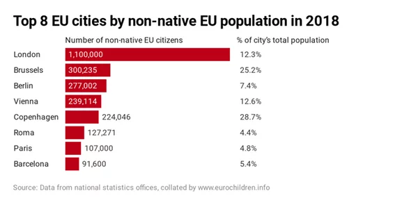 London has been a beacon for this wider project. Brussels, a city that hosts the second largest population of non-native EU citizens, only holds about a quarter of London’s non-native EU citizens. Other European cities follow by a long distance.