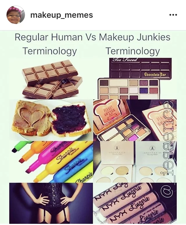 This meme (figure 8) even makes a distinction between ‘regular human terminology’ and ‘makeup junkies terminology’. When non-makeup lovers hear the word ‘chocolate’, they would never associate it with the popular eyeshadow palette called the ‘chocolate bar’, a makeup lover will. And ‘regular humans’ will never think of the liquid lipstick line called ‘lingerie’ by the brand NYX when they hear the word ‘lingerie’.