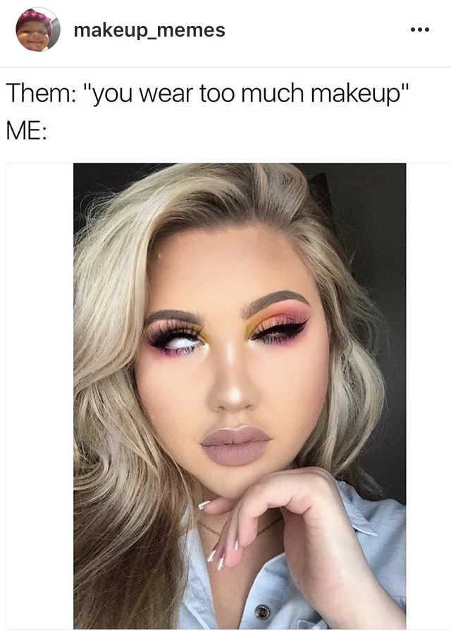 In one of the examples (figure 6), we see that a stigma surrounding people who wear a lot of makeup is addressed. Non-makeup lovers seem to believe that the reason why makeup lovers wear so much is because they are insecure and that they use makeup in order to cover their imperfections. In the other meme, it is addressed that makeup lovers often get to hear that they wear too much make-up. 'Them' refers to the non-makeup lovers and the 'me' in the picture shows enough features (Blommaert & Varis, 2012) - blended eye shadow, foundation and highlighter - to be identified as a makeup lover. Non-makeup lovers seem to be oblivious to the fact that makeup lovers wear it not because they do not like their natural face of to impress someone, but simply because they like to experiment with makeup and create different looks.