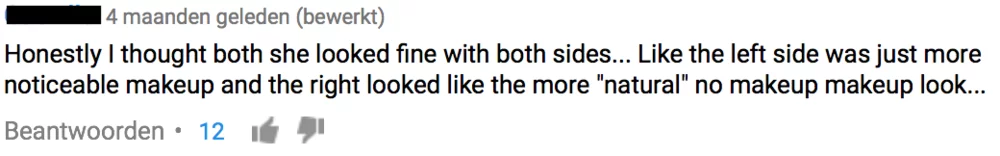 Certain norms about how you should wear make-up are being conveyed. You should not colour in your eyebrows too dark, you should not wear a foundation shade that is too dark and you should not apply your highlight and blush too heavily. However, they only seem to apply on certain occasions. Various users commented (figure 2) on her video that they thought some things on the “wrong” side of her face looked good and that that is how they would wear their makeup on some occasions. So, we see that the video of Christen Dominique only teaches you the norms when going for a more natural and everyday look. However, when you go out or go to a party different norms seem to apply.