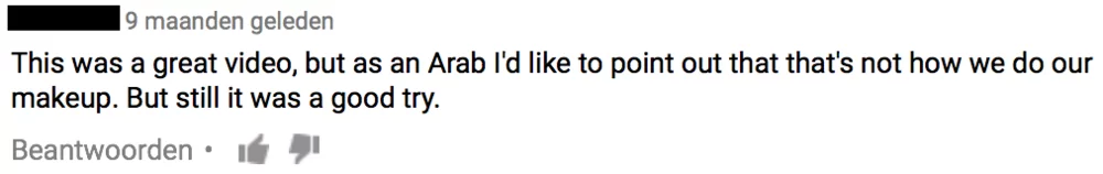 Western culture is the most dominant in this micro-population; people from America, Canada, Australia and Europe fall under the same centre of normativity in which the same techniques and trends apply. The ‘how to’ video, I discussed previously is a good example of the norms in this centre. Interestingly, you would expect that Muslim/Arabic culture is a centre on its own. However, it seems to be the case that makeup lovers from Arab countries and Western countries have the same norms. There are various videos on YouTube that seem to point out the difference between these two cultures. However, many Arabs commented (figure 3) that that is ‘old school’ and that their makeup is actually similar to Western makeup.