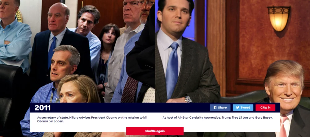 Clinton is happy to present herself as the experienced politician with a long history in politics. A quick look on Clinton’s campaign website shows a summary of Clinton’s history in politics and the actions she undertook. She seemed especially eager to highlight this in contrast to Donald J Trump’s lack of political experience. Take for instance this online tool (shown below) that clearly contrasts ‘way back when’ Clinton was in politics and Trump was hosting celebrity shows (Clinton, 2016).