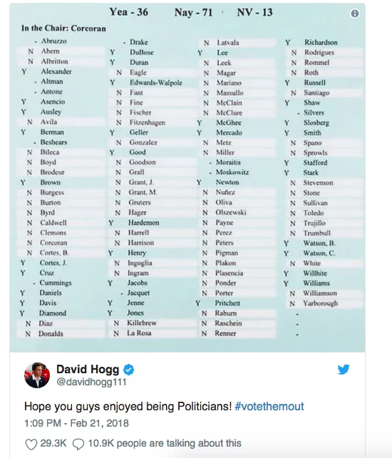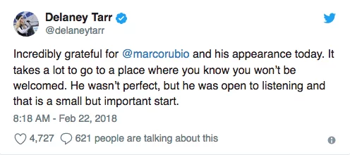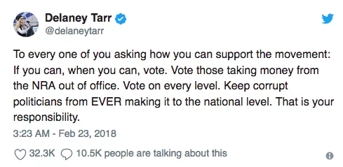 The tweet received over 29,000 likes and almost 11,000 people were talking about the topic. Hogg’s statement was backed up by fellow survivor, Delaney Tarr, who stated that “We've had enough of thoughts and prayers...we are coming after every single one of you and demanding that you take action, demanding that you make a change." on live television. She also took to her personal account on Twitter and told her large following that the need to vote was crucial in order to keep the NRA out of office [Figure 9] and even thanking Rubio for listening to the survivors. [Figure 10]