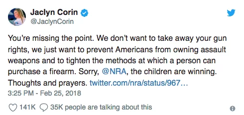 Corin’s tweet ended with a sarcastic ‘thoughts and prayers’, alluding to the fact that after every mass shooting, condolences are sent and everyone prays but they mourn and move on until it happens a second time. These students are saying there should not be a second time, and they seem to have some powerful people in their corner as Barack Obama, 44th president of the United States, also tweeted out a supportive message.