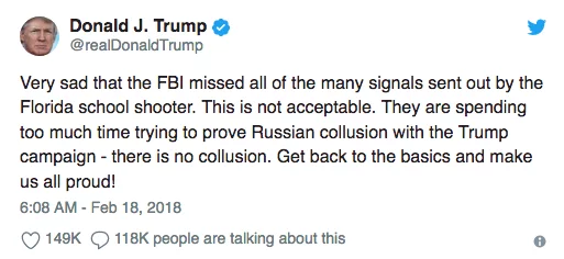 This could be seen as a direct response to Trump’s reply after the shooting at Marjory Stoneman Douglas as he did not mention gun violence. Instead the president tweeted that he was sad that “the FBI missed all of the many signals sent out by the Florida school shooter.” He went on to say that it was unacceptable and too much time is spent trying to prove Russian collusion with the Trump campaign, ending with the statement that the FBI should get back to the basics and makes us all [Americans] proud.