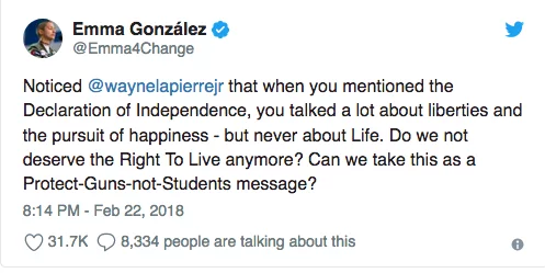 The students call out these people, shrugging off any criticisms and sticking to their mission which is achieving sensible gun laws. The tweets get a lot of attention, especially since the students utilize Twitter to shut down conspiracy theories that they’re paid ‘crisis actors’ , trolling political figures, vocalizing their opinions and memorializing victims of the massacre. One tweet that certainly got my attention is Figure 4, where Gonzalez directly calls out NRA CEO and Executive Vice President Wayne LaPierre Jr.