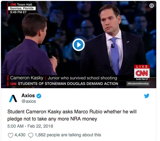 This directly tied into the day when members of the NRA, including Marco Rubio, attended a question and answer (Q&A) session at Marjory Stoneman Douglas, to answer any of the questions the students had (Moran, 2018). Many had been hopeful that Rubio, who was previously a speaker of the Florida House Representatives, would understand the situation through their perspective. Survivor Cameron Kasky even went as far as to directly ask Rubio if he would pledge to no longer take money from the NRA on national television. Rubio swiftly avoided the question, instead trying to sympathize and explain why the NRA worked the way they did, but the survivors wanted an answer which created tension in the building.