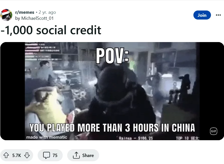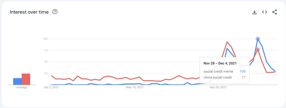 Despite its name, the SoCS meme’s origins weren’t from the Chinese scheme. Instead, its origins are more akin to wumao (50 cents) in the Chinese internet landscape: Commentators routinely posting pro-China troll comments for minimal monetary returns. In the Russian context, the meme started as a mockery to pro-China comments written in broken Russian on local forums. Their salaries for their ‘hard work’ – 15 Rubles per comment – is then highlighted in images circulating in 2021, which are sarcastically related to social credits rather than money. In the West, meanwhile, although it was used on Reddit earliest in April of that year, it wasn’t until late 2021 when various video remixes went viral on YouTube, which in turn pushed the query “social credit meme” to its highest per Google Trends.