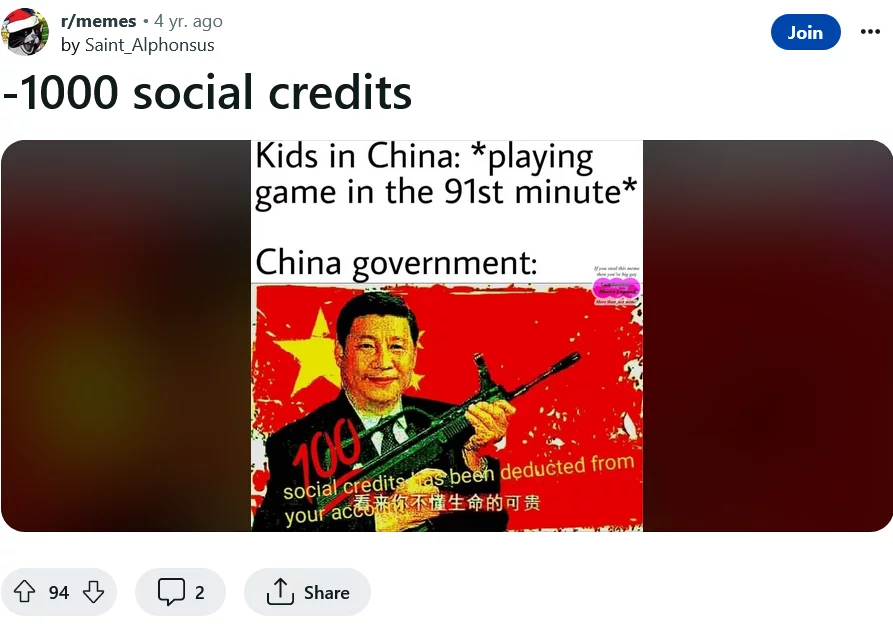 Zhou, V. (2021, October 25). People don’t understand China’s Social Credit, and these memes are proof. VICE. https://www.vice.com/en/article/pkpe3z/china-social-credit-meme.