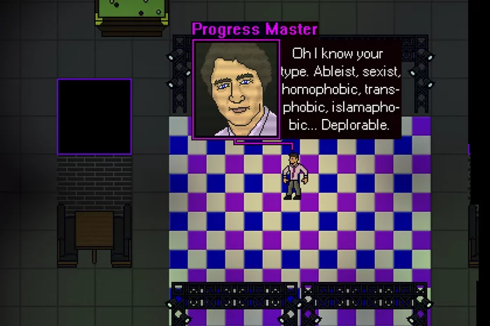 The ‘mini-bosses’ provide context as they condemn the actions undertaken by the player (who has no choice by definition of the functioning of the game’s mechanics) before engaging in combat with them. Figure 2 displays the ‘mini-boss’ encountered in the LGBTQ club – “Progress Master” accuses the player character of 'lack of tolerance'. “Red Terror” proclaims that while communism historically concerned equality for the proletariat, they expanded their mission to entail equality for all.