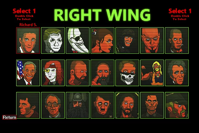 The “Right Wing Death Squad” character selection screen comprises 21 unlockable characters, modelled after well-known new-right figures both fictional and real.