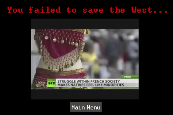 When president Trump is rescued, the win condition is met and the player is stated to have saved Western civilization – perhaps revealing its most intricate rhetoric. While the player character is virtually silenced, Donald Trump is (literally) a voice against their common enemies – and by extension, a protector of common values.
