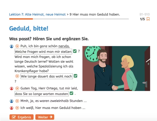 Chapter seven, exercise nine: “Hier muss man Geduld haben” (here, you need patience)—Scenario 1: “Geduld, bitte!” (patience, please!): A young man, referred to as Herr Ortega (Mr Ortega), waits in at a counselling centre for professional recognition. He is a trained nurse and is in the process of having his foreign vocational qualifications officially recognized so that he can enrol in vocational re-training and eventually continue his career. The exercise calls for filling in the blanks to a dialogue transcript between Mr Ortega and an office employee who is consulting him on the professional recognition procedure. Buttons to the left of the transcript, play the dialogue audio in full. The scenario begins with Mr Ortega’s voice: “Wow, I am pretty nervous. What questions will they ask me? Will they ask me if I have been learning German for a while? Will they want to know what my specialization is in nursing? How much longer is this going to take?”, he wonders. The office employee arrives, apologizing for keeping him waiting for so long. “Yeah, I have been waiting for two-and-a-half hours…” Mr Ortega replies, irritated. “I know,” says the office employee, “here, you need to have patience”.