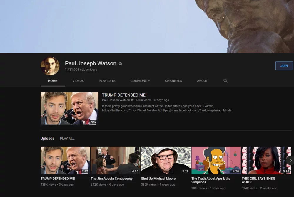 Here you see the paradox of the New Right discourse: even though YouTube and all mainstream media are constantly being framed by New Right actors as part of the liberal establishment, they are nevertheless very well integrated in these platforms. "While they posture as being underground and facing censorship from YouTube, they also know they are being given a major platform from which to broadcast their views." (Lewis, 2018). This paradox was also voiced by Paul Joseph Watson when he tweeted a photo of himself holding up a plaque YouTube sent to him for surpassing one million subscribers. He added a caption: “YouTube secretly loves me.”