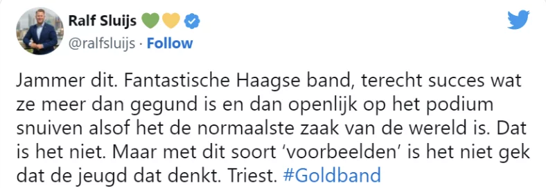 “What a shame, amazing band from The Hague. They achieve genuine success and proceed to openly use cocaine on stage as if it were nothing out of the ordinary. Which it isn’t. But it is understandable that young people might believe that with examples like this. Sad. #Goldband” (translated) (figure 1).