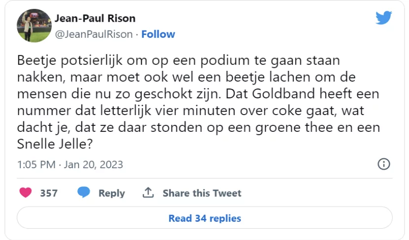 “Kind of potty-mouthed to stand on a stage snorting, but I also have to laugh a little at the people who are so shocked now. That Goldband has a song that is literally about coke for four minutes. What were you thinking, that they would be standing there with green tea and a Snelle Jelle?” (translated) (figure 2).