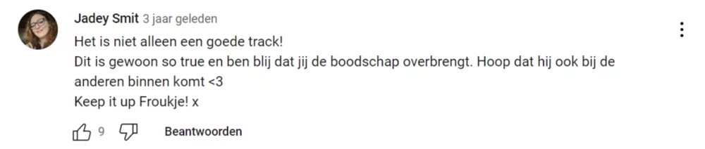 “It’s not only a good track! This is just so true and I’m glad you are spreading the message. I hope it also resonates with others <3 Keep it up Froukje! x” (translated) (figure 3).