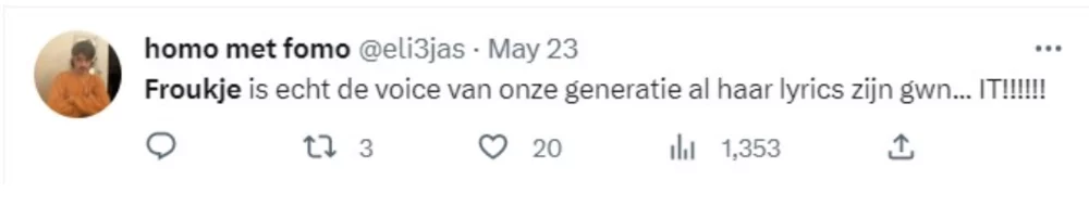 A big part of Froukje’s success comes from her meaningful lyrics. Fans have previously called her: “(...) the voice of our generation” (translated) (figure 4) and this might even be true.